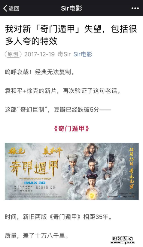 比如国产动画片《西游记之大圣归来》优质却小众,他们甘做自来水;徐克大片《奇门遁甲》上映,他们却吐槽虚弱的故事、低级的特效……为了保持独立,他们只接受汽车、快消类等广告,拒绝影视行业广告。