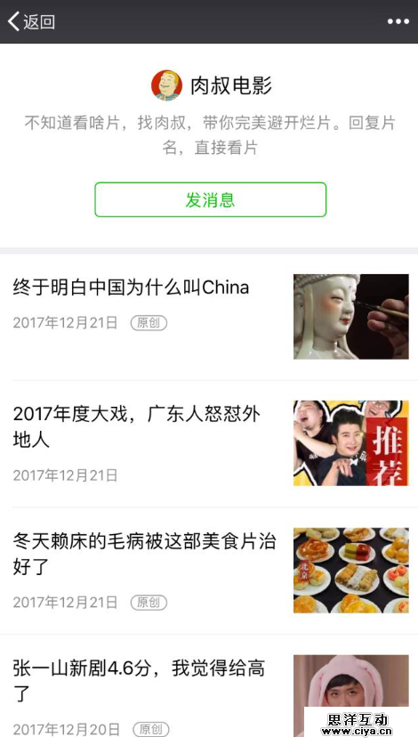 第三类账号因为充满了浓郁的真情实感表达,更符合微信用户的内容消费习惯,因此往往会吸引来更多的粉丝,产出更活跃的UGC。这其中典型代表就是“Sir电影”,成立两年,坐拥 2000 万粉丝,每篇头条阅读都能达到 10 万+,估值超过 3 亿元,下面我们就看看它是怎么起来的。
