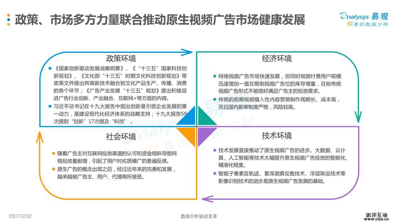Analysys易观发布《中国原生视频广告专题分析2017》,分析认为在网络视频和移动端海量用户支撑下,原生视频广告市场前景广阔,在全行业的通力合作下,原生视频广告正处于高速发展阶段,产业生态基本成熟。易观认为技术和数据是未来原生视频广告厂商发展的核心竞争力;而原生视频广告将继续与消费场景融合,场景原生将成为未来方向。