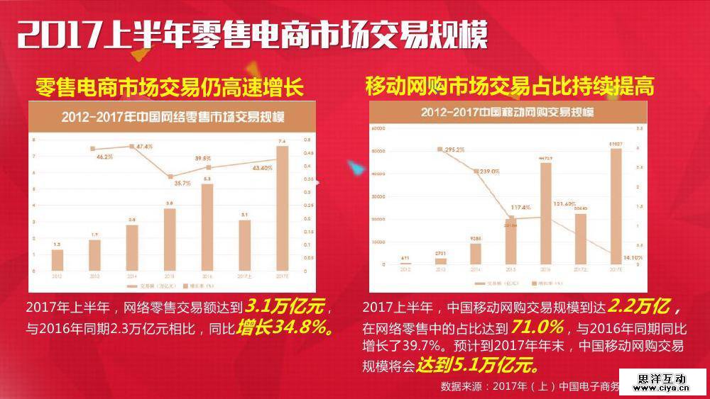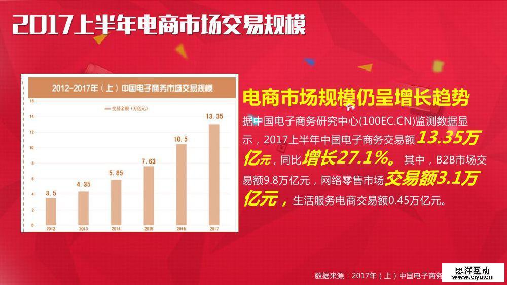 2017上半年中国电子商务交易额13.35万亿元,同比增长27.1%。其中,B2B市场交易额9.8万亿元,网络零售市场交易额3.1万亿元,生活服务电商交易额0.45万亿元。