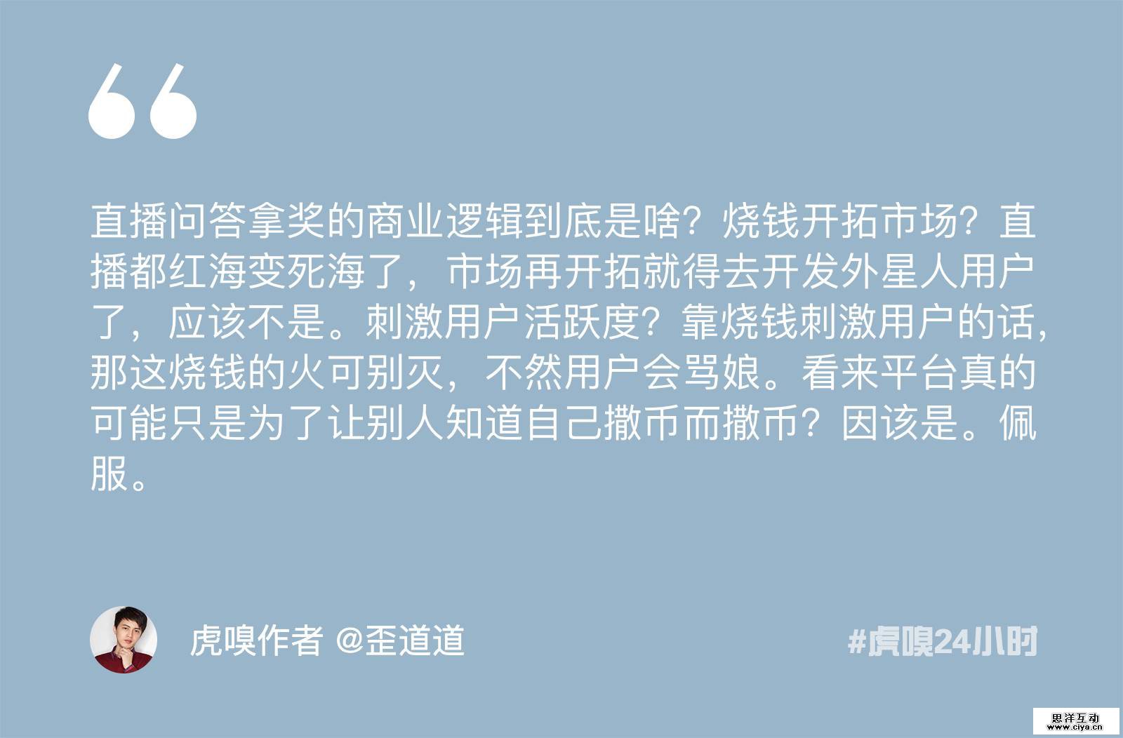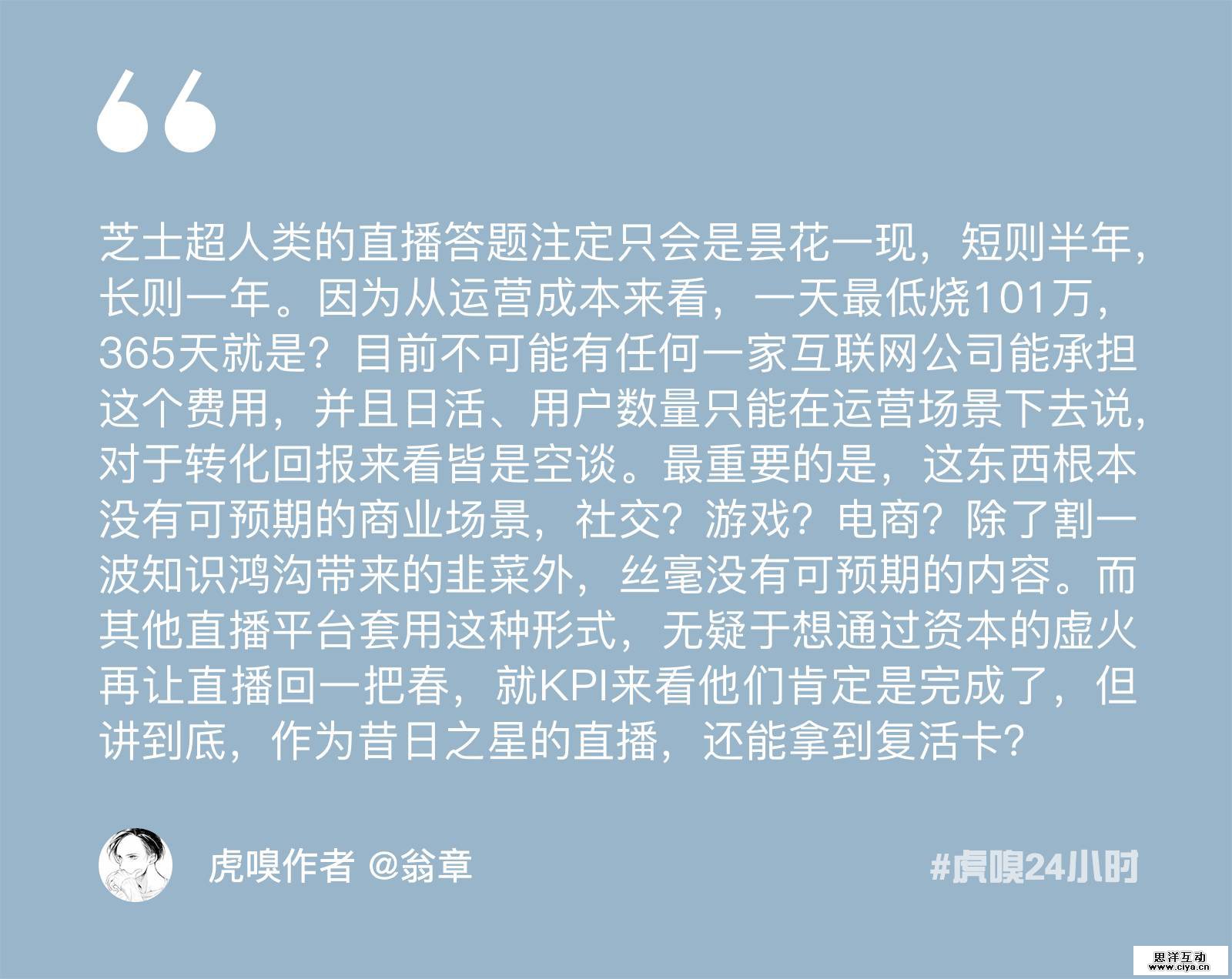 在本周,最热的新闻来自“直播答题”,这也成了一场全民的狂欢。映客的芝士超人,头条的百万英雄,花椒的百万赢家,一直播的黄金十秒纷纷上线,还有更多的直播答题产品正在路上...... 直播答题究竟是下一风口还是经不起考验的泡沫?烧钱撒币的狂欢终点在哪里?来看看以下几个观点~