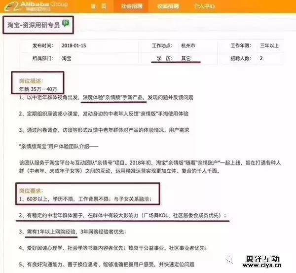 从招聘页面上显示的岗位背景介绍看,接下去,淘宝将全面围绕中老年消费群体的场景和需求定制新的亲情版本体验,并打通家人之间的互动,运用精准运营实现更加立体、复合的千人千面。也就是说,这个职位的作用是,以老人的视角,帮助淘宝更好地了解老人。