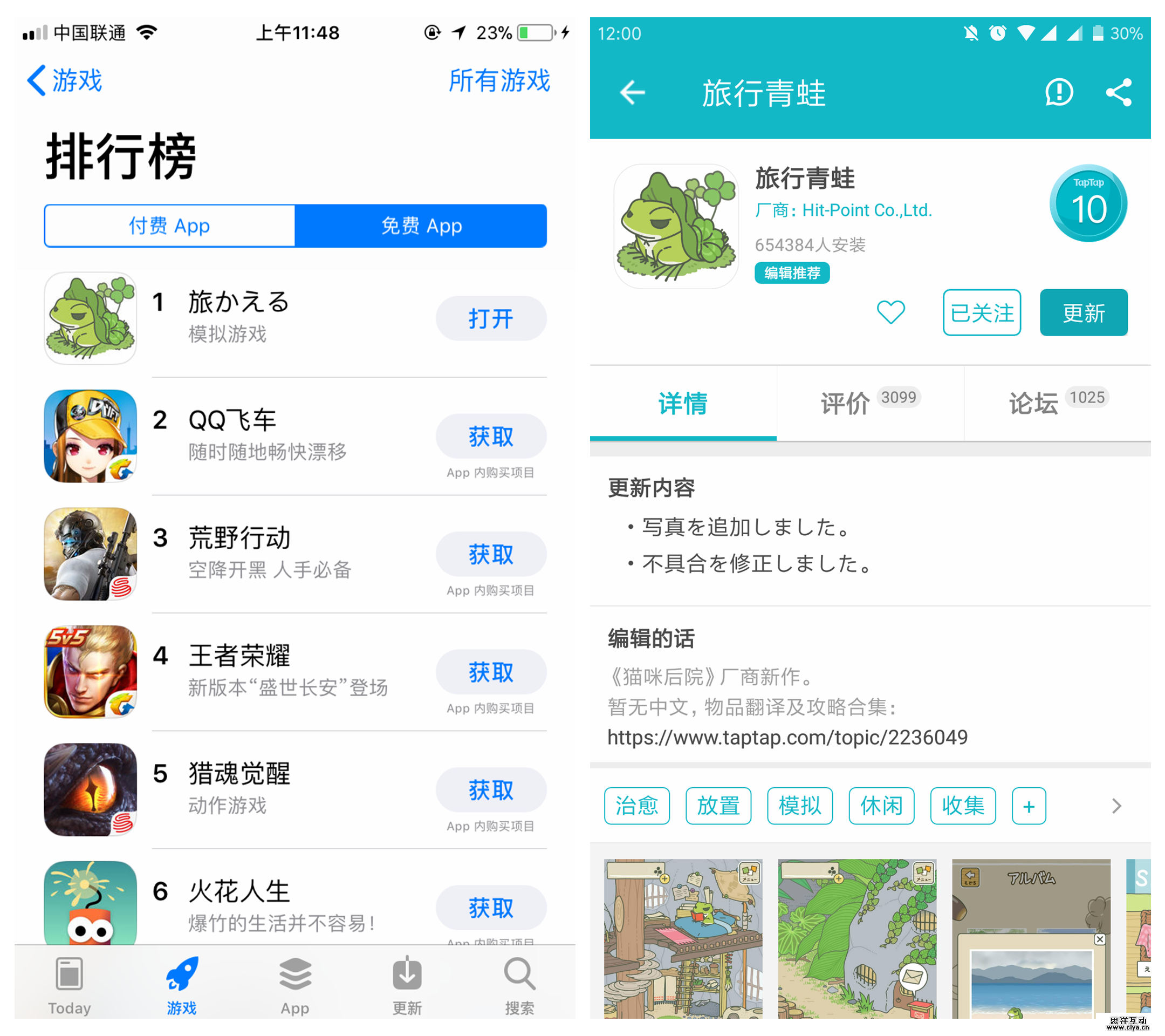 《旅行青蛙》去年 12 月 6 日在日本市场的 iOS 平台上线,排名一直在 App Store 游戏免费榜 TOP 50 左右。但这款游戏近期在国内市场成绩却逐渐走高,到今天,这款游戏已经登上了 App Store 游戏免费榜第一,在 Tap Tap 上评分也达到了满分 10 分。