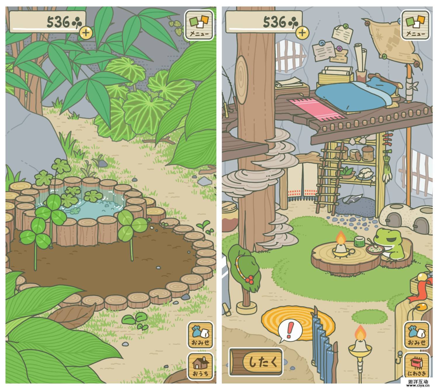 游戏的主要机制也相当简单,即使不懂日语也可以愉快的养蛙。首先玩家需要采集庭院内的三叶草作为货币,购买“便当”“幸运物”“道具”三种商品。为青蛙准备好“旅行物资”以后,它会在某个时间点出去旅行,至于什么时候出去,什么时候回来,就看它的心情了,玩家们没法设定,也没法看到进度。