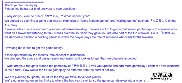 《旅行青蛙》制作团队给新浪科技的采访回复截图