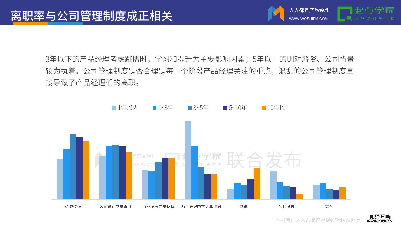 3年以下的产品经理考虑跳槽时,学习和提升为主要影响因素;5年以上的则对薪资、公司背景较为执着。公司管理制度是否合理是每一个阶段产品经理关注的重点,混乱的公司管理制度直接导致了产品经理们的离职。