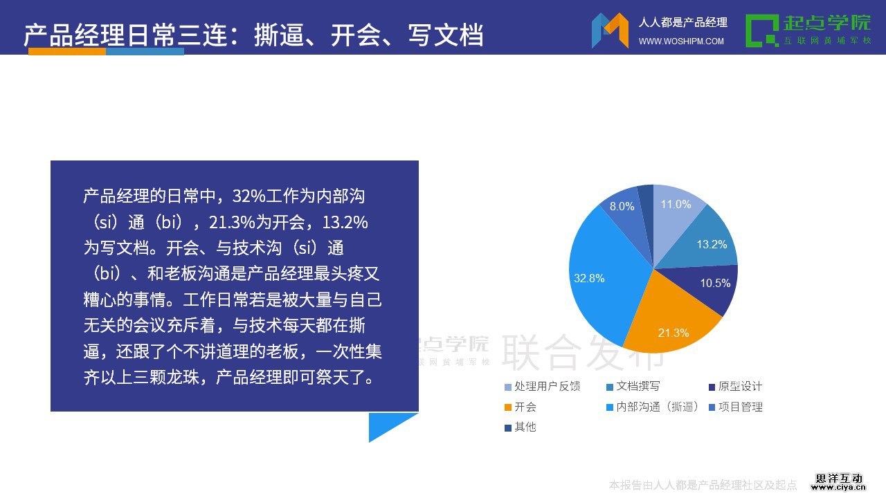 产品经理的日常中,32%工作为内部沟(si)通(bi),21.3%为开会,13.2%为写文档。开会、与技术沟(si)通(bi)、和老板沟通是产品经理最头疼又糟心的事情。工作日常若是被大量与自己无关的会议充斥着,与技术每天都在撕逼,还跟了个不讲道理的老板,一次性集齐以上三颗龙珠,产品经理即可祭天了。