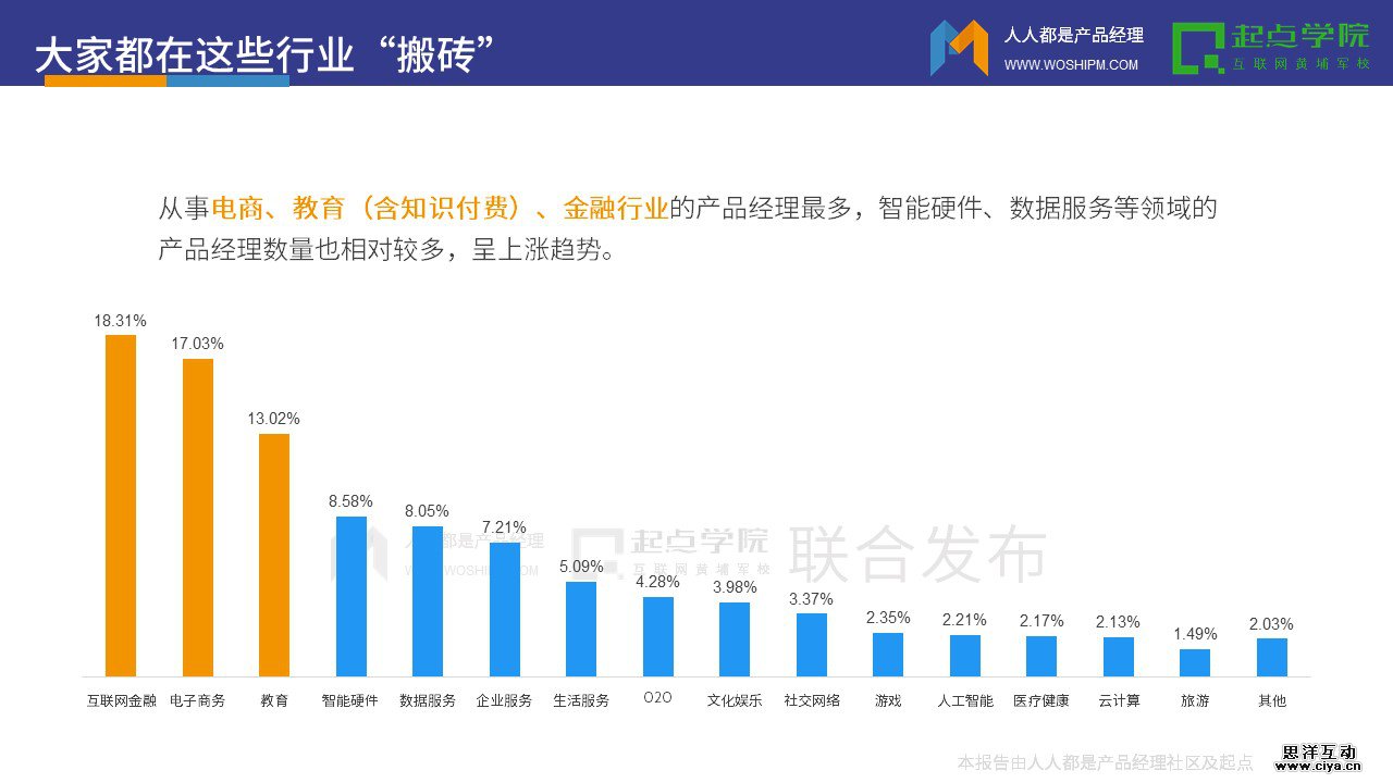 从事电商、教育(含知识付费)、金融行业的产品经理最多,智能硬件、数据服务等领域的产品经理数量也相对较多,对比去年呈上涨趋势。