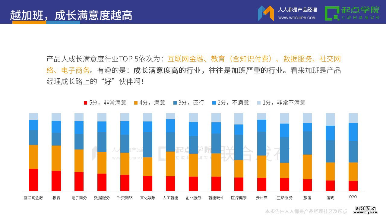 产品人成长满意度行业TOP 5依次为:互联网金融、教育(含知识付费)、数据服务、社交网络、电子商务。有趣的是:成长满意度高的行业,往往是加班严重的行业。看来加班是产品经理成长路上的“好”伙伴啊!