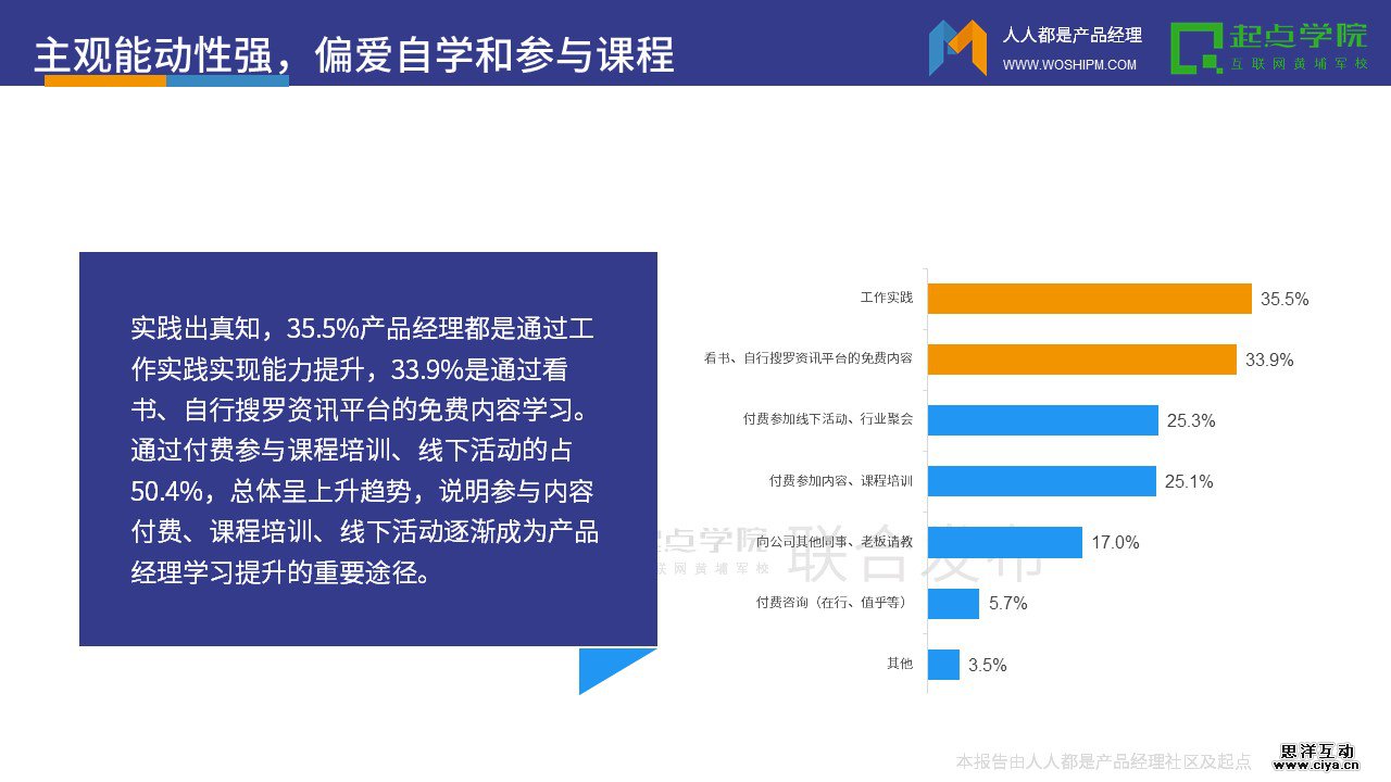 实践出真知,35.5%产品经理都是通过工作实践实现能力提升,33.9%是通过看书、自行搜罗资讯平台的免费内容学习。通过付费参与课程培训、线下活动的占50.4%,总体呈上升趋势,说明参与内容付费、课程培训、线下活动逐渐成为产品经理学习提升的重要途径。