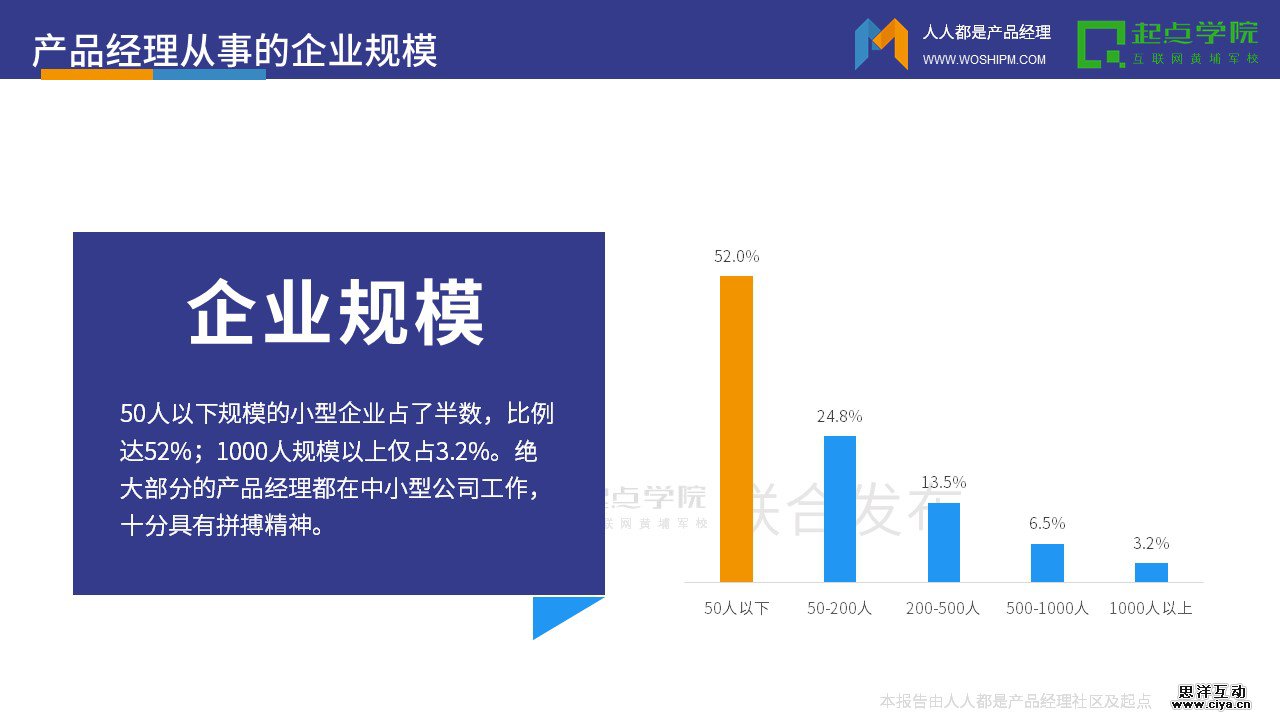 50人以下规模的小型企业占了半数,比例达52%;1000人规模以上仅占3.2%。绝大部分的产品经理都在中小型公司工作,十分具有拼搏精神。