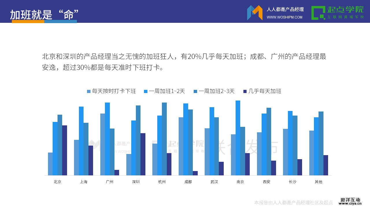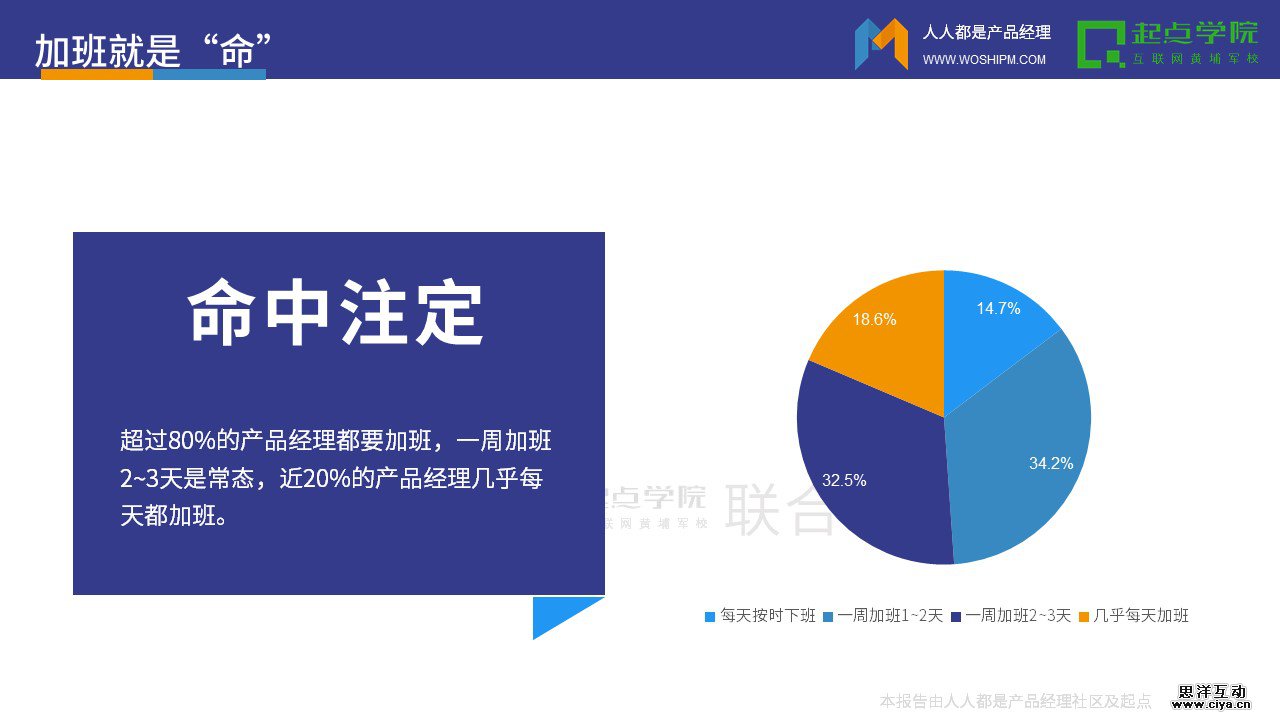 超过80%的产品经理都要加班,一周加班2~3天是常态,近20%的产品经理几乎每天都加班。