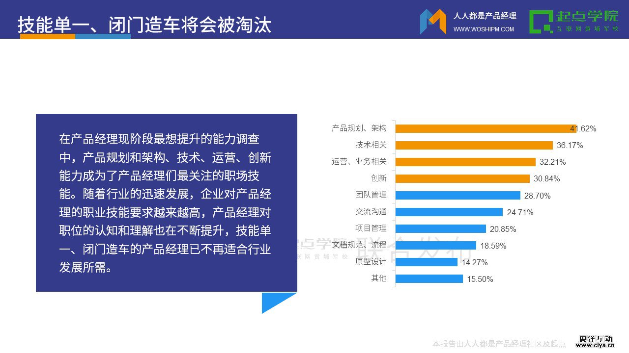 在产品经理现阶段最想提升的能力调查中,产品规划和架构、技术、运营、创新能力成为了产品经理们最关注的职场技能。随着行业的迅速发展,企业对产品经理的职业技能要求越来越高,产品经理对职位的认知和理解也在不断提升,技能单一、闭门造车的产品经理已不再适合行业发展所需。