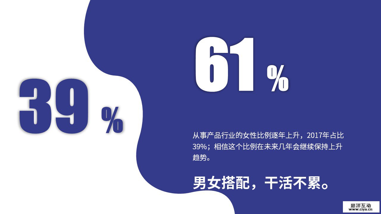 从事产品行业的女性比例逐年上升,2017年占比39%;相信这个比例在未来几年会继续保持上升趋势。男女搭配,干活不累。