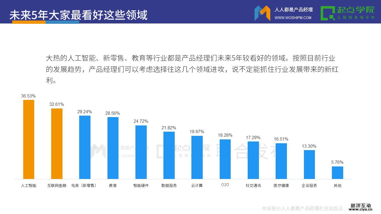 大热的人工智能、新零售、教育等都是产品经理们未来5年较看好的行业发展领域。按照目前行业的发展趋势,产品经理们可以考虑选择往这几个领域进攻,说不定能抓住行业发展带来的新红利。