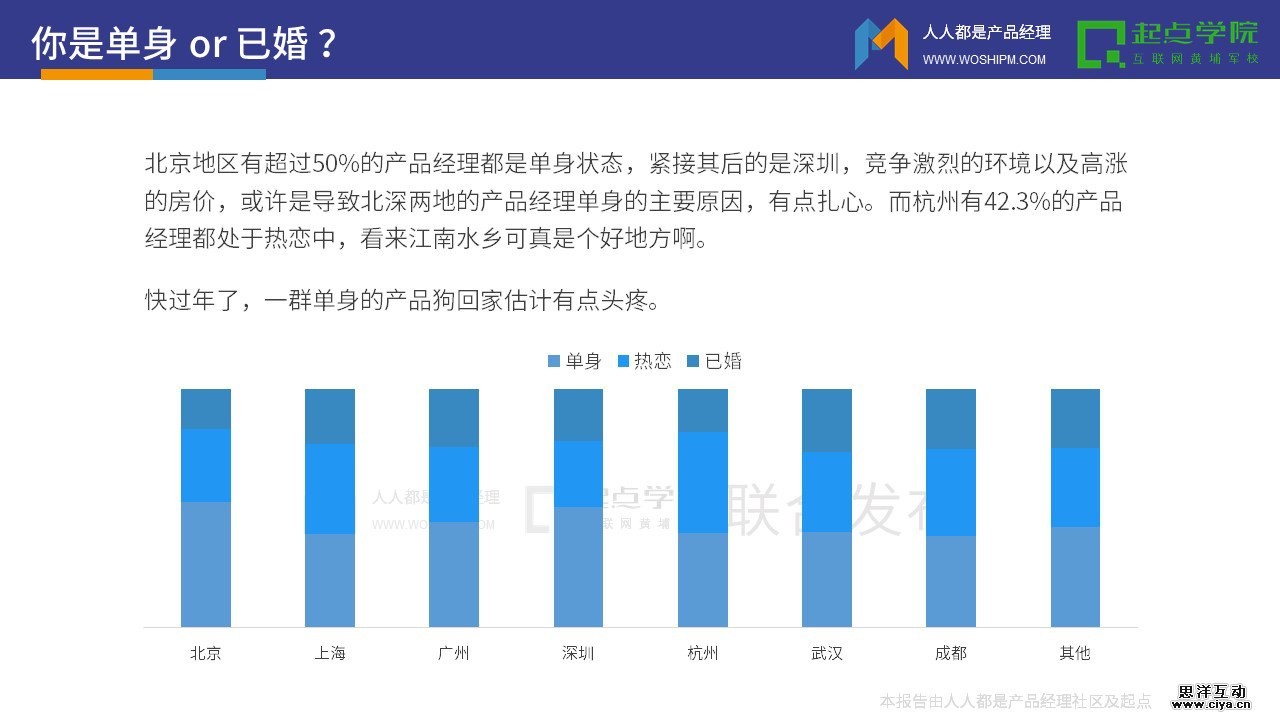 北京地区有超过50%的产品经理都是单身状态,紧接其后的是深圳,竞争激烈的环境以及高涨的房价,或许是导致北深两地的产品经理单身的主要原因,有点扎心。而杭州有42.3%的产品经理都处于热恋中,看来江南水乡可真是个好地方啊。