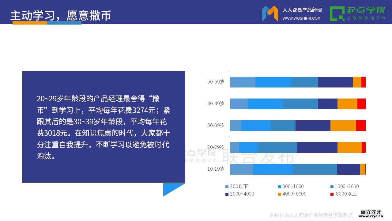 20~29岁年龄段的产品经理最舍得“撒币”到学习上,平均每年花费3274元;紧跟其后的是30~39岁年龄段,平均每年花费3018元。在知识焦虑的时代,大家都十分注重自我提升,不断学习以避免被时代淘汰。