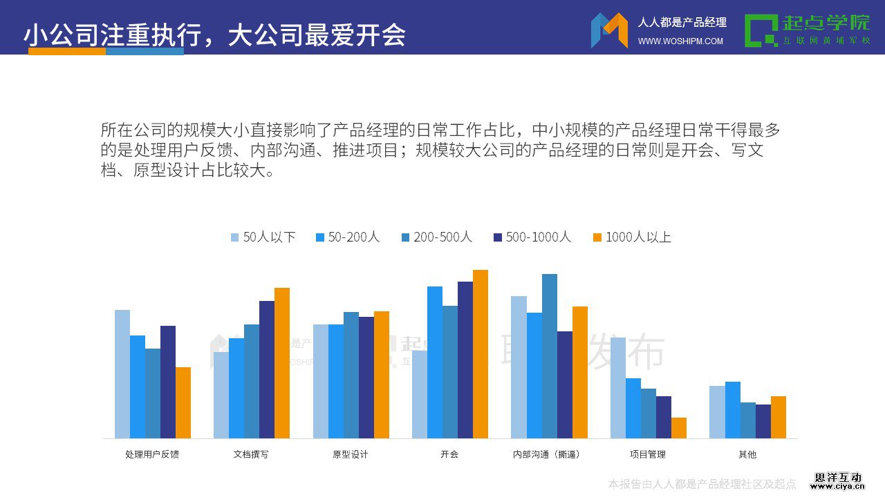 所在公司的规模大小直接影响了产品经理的日常工作占比,中小规模的产品经理日常干得最多的是处理用户反馈、内部沟通、推进项目;规模较大公司的产品经理的日常则是开会、写文档、原型设计占比较大。
