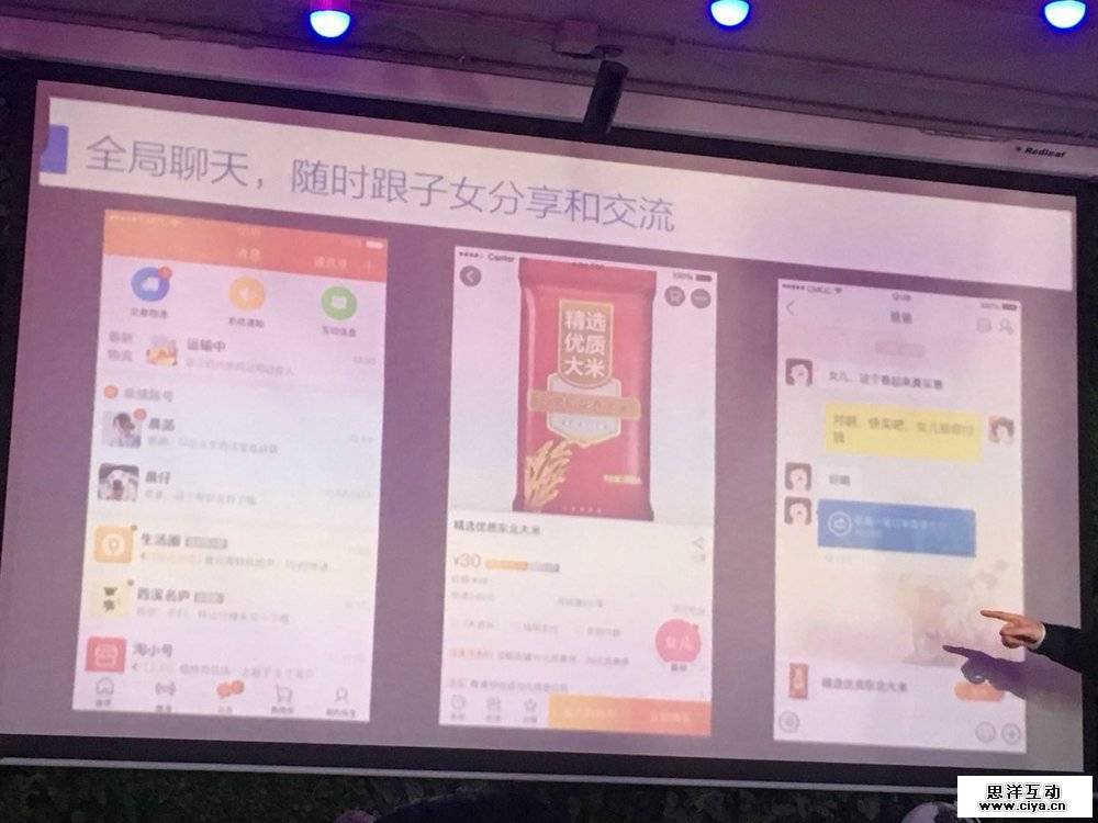 3. “聊天”是该产品的核心功能。图片中显示,右下角有一个悬浮键,父母可以通过一键分享发给子女进行讨论,子女可以帮其做一些参谋。这跟原版淘宝不同的地方就在于,聊天场景下的交流对象由消费者与商家,变成了消费者与消费者之间的沟通。