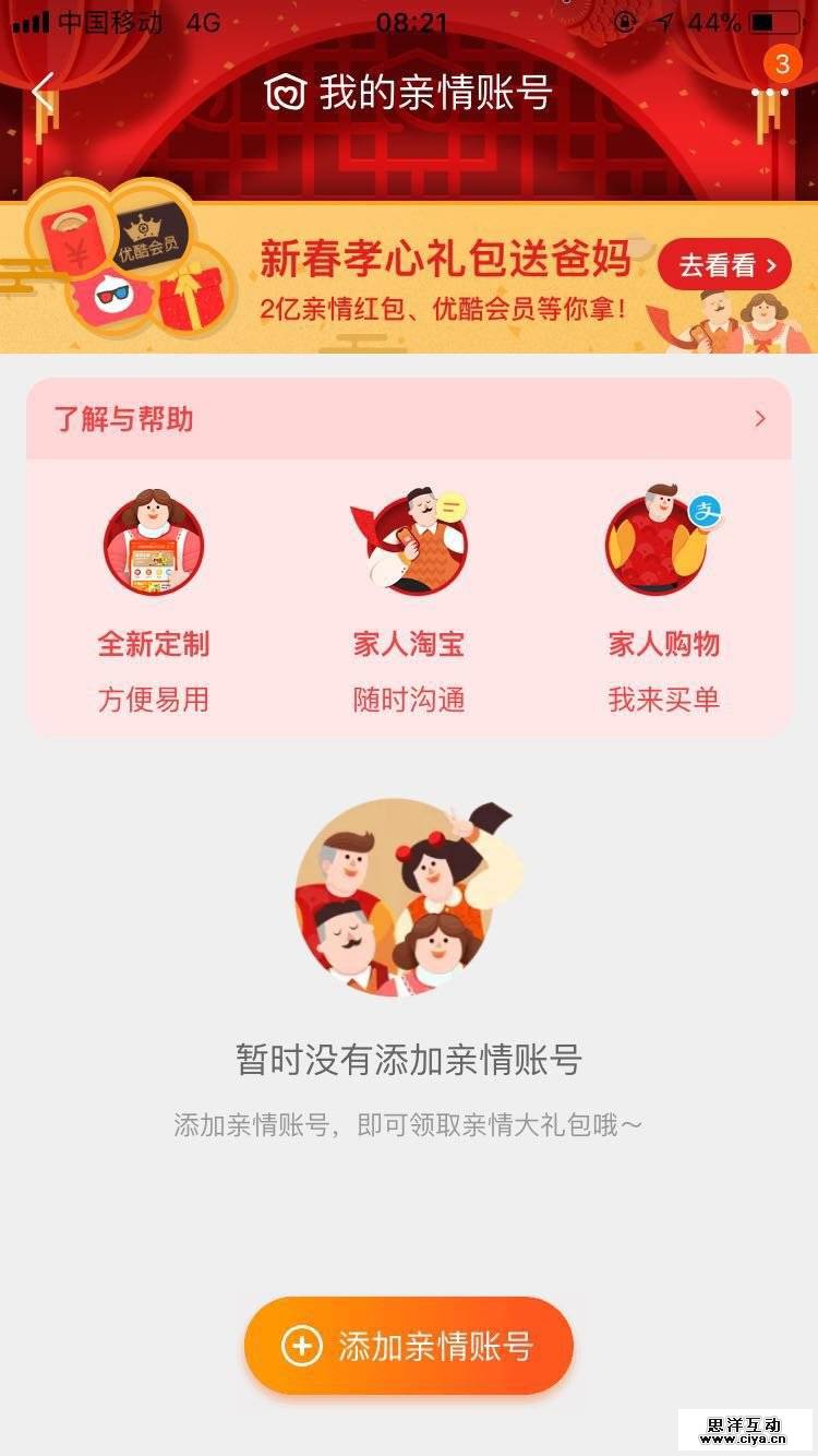 至于产品,“非常简单。”产品经理季山说,“通过开通亲情账号,子女、父母、配偶之间可以相互绑定亲情关系账户。完成绑定后,大家可以在淘宝内互动与沟通,还可以代付。”