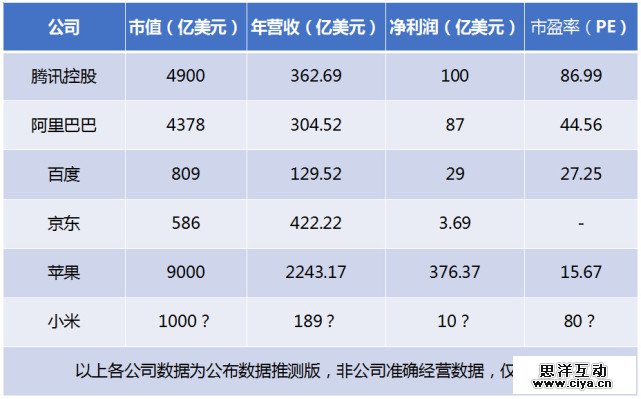 我们就用雷军的方法再来算算,每个用户还是按照价值 380 美元计算, 2017 年是小米复苏的一年,小米手机出货量突破了 9000 万部,全球 MIUI 用户数达到 3 亿,按照 3 亿用户计算,小米的市值可以达到 1140 亿美元。不过,如果按照类似的计算方法(苹果用户价值按照小米的 4 倍计算),苹果现在的市值将轻松超过1. 5 万亿美元,是现在苹果市值的1. 9 倍。所以这种算法肯定是值得商榷的。