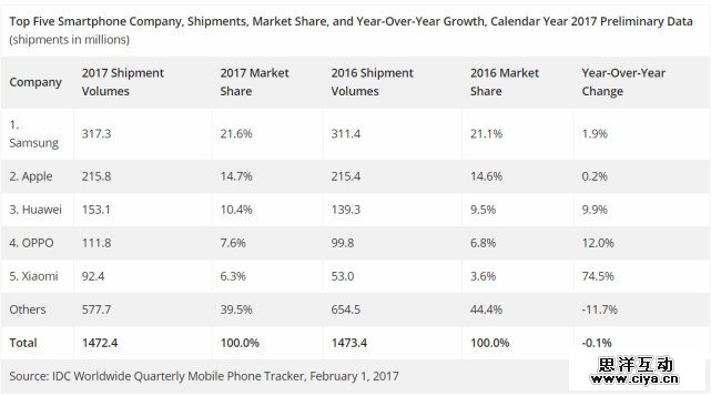 不过,手机整体市场的下滑,将给手机市场带来巨大的压力。据调查机构 IDC 的数据,全球智能手机出货量在 2017 年首次出现同比下降,由 2016 年的 14.734 亿部下降到 2017 年的 14.724 亿部,降幅为 -0.1%。尤其在 2017 年第四季度,全球智能手机供应商销售了总计4. 307 亿部智能手机,较 2016 年第四季度的4. 035 亿部下跌了6.3%。在5G正式商用之前,手机整体市场可能都会处于低迷状态。