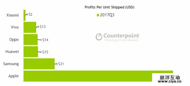 市场销售额上升,但是利润率无提升甚至是下降,这对小米来说也是一个巨大的挑战。调研公司Counterpoint Research发布的 17 年第三季度(也是小米手机增长最快的季度)主流手机厂商的利润报告中显示,小米每部手机赚取的利润是 2 美元,而排名第五的vivo手机为 13 美元;排名第四的OPPO手机 14 美元;排名第三的华为手机 15 美元;排名第二的三星手机 31 美元;排名第一苹果手机 151 美元。