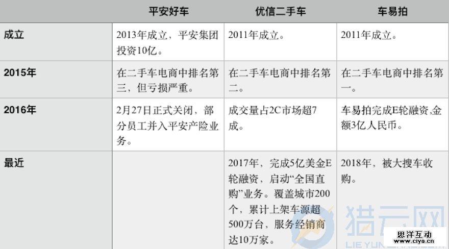 与平安好车同台竞争的优信二手车采用的则是B2B2C模式,并于去年再度获得大额融资。车易拍近年来市场份额也在逐渐萎缩,今年 2 月大搜车收购了车易拍。