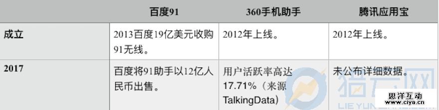 拥有如此体量的用户, 91 助手的价值不言而喻——流量入口、分发通道。它一度被阿里、百度、 360 等互联网巨头视为第三方应用领域的肥肉。