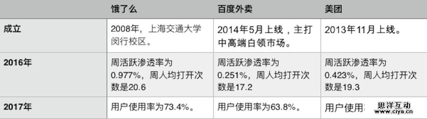如上图显示,饿了么与美团领跑外卖市场、百度外卖紧随其后,同时百度外卖在白领市场的渗透率略高于其他外卖平台。外卖三巨头真可谓三足鼎立,长期呈现割据态势。