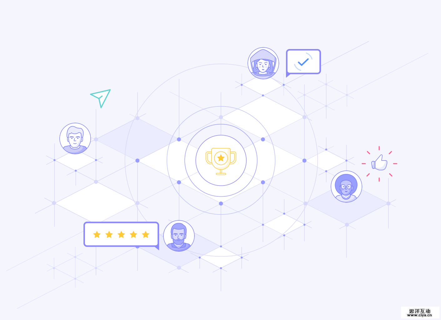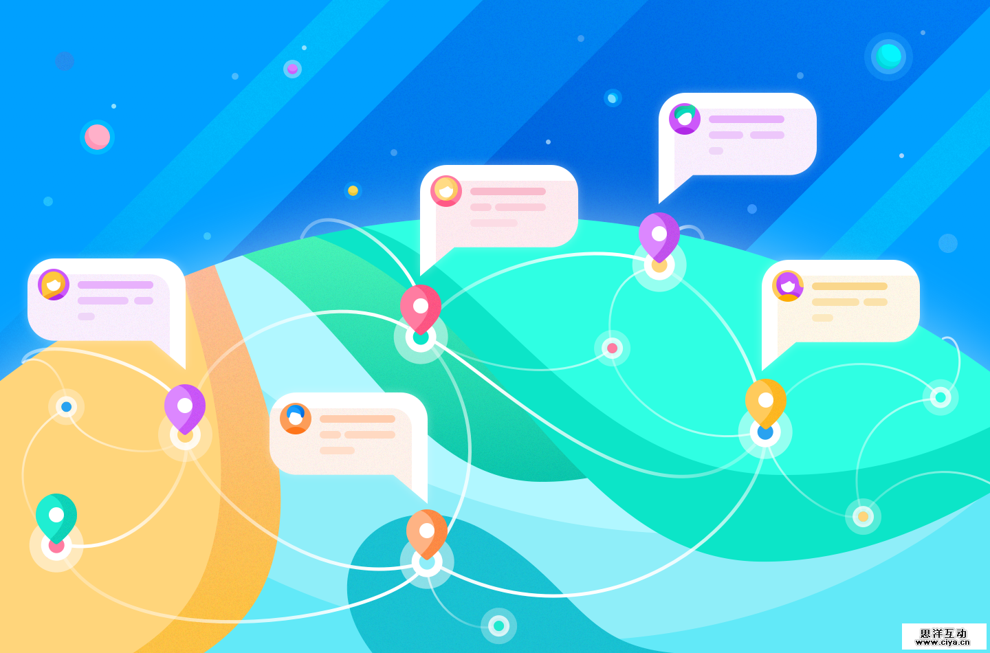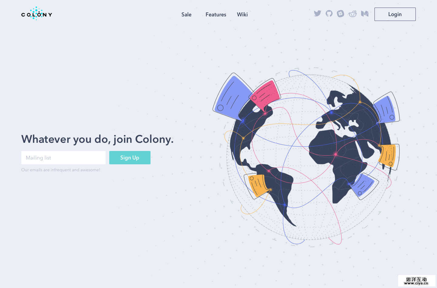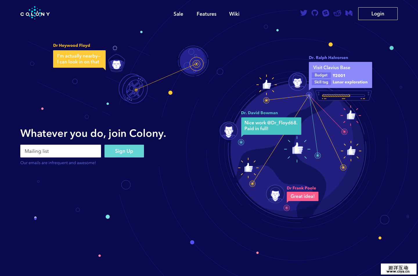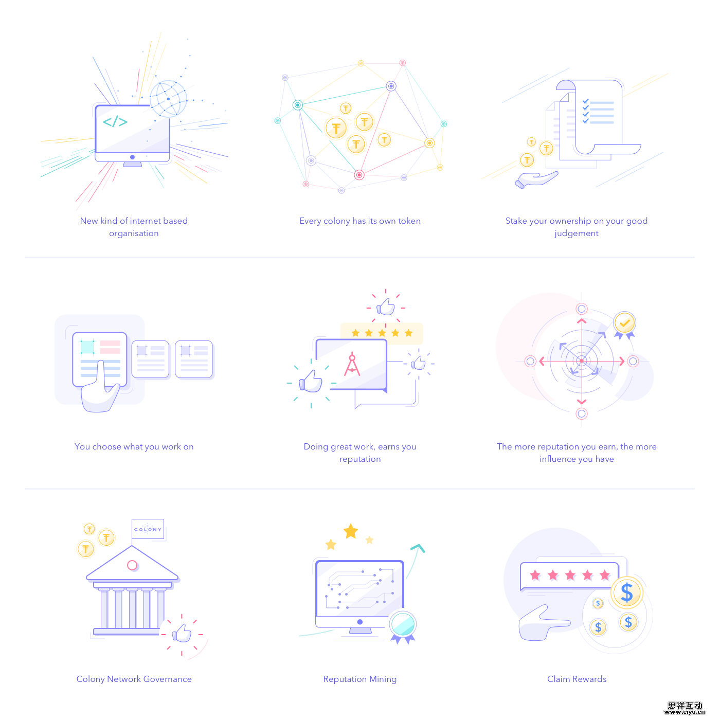 设计师们拿出了不同风格的插画,它们在主题上和整个UI保持一致,营造出友好、平易近人的氛围,同时也让人对整个公司形象产生足够的好感。插画中展示出 Colony 是如何帮助世界各地的用户沟通、交流、达成目标的。