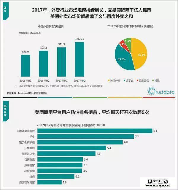 不久前,数据公司Trustdata发布《2017年中国移动互联网行业发展分析报告》表明,饿了么与百度外卖份额之和为46%,稍逊于美团外卖46.1%的份额;在用户粘性上,饿了么商家版日均打开次数6.8,美团外卖则为9次。