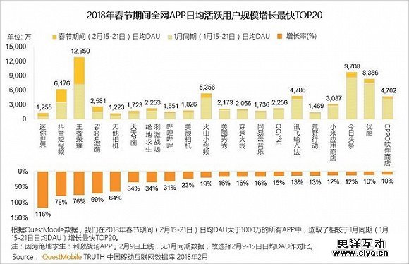 下图是QuestMobile统计的春节期间全网日活增长最快的APP,可以看到,在2月15日到2月21日期间,抖音的日活增长了3000多万,在全网APP中排名第二。