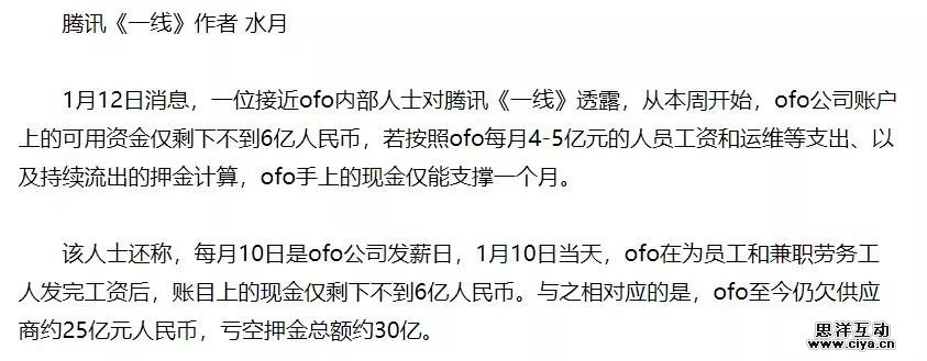 今年 1 月份的时候,腾讯就爆料,ofo 资金链断裂,账面上的钱只能支撑 ofo 运营一个月,而欠供应商的款却有 25 亿。。