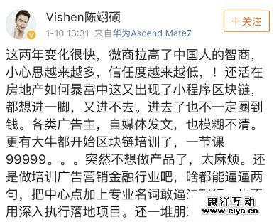 微博网友王者flyer吐槽道:区块链到底是什么?也许朋友圈里真正理解的人寥寥无几,但这不妨碍你他们为获得各种区块链只是迫切得付费入群、购买学习课程。各种蹭热度建立的冒牌大佬群、随便网上搜罗文章合成的所谓学习资料包也应运而生,据说还有微商培训界的人士开始进军区块链培训。