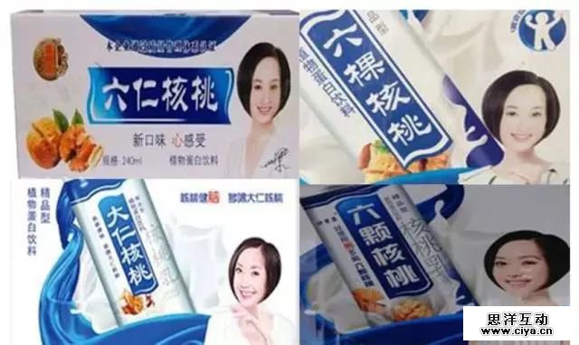 除了在产品类型上跟风模仿,有的公司在外包装上也是煞费苦心。产品都和某品牌核桃乳非常相似,“六个纯核桃”只多了一个字;“六仐核桃”、还有“六禾核桃”,只是一笔一划的差别。外观设计,包装色调,构图,代言人形象也是他们模仿的主要内容,让人难以分辨。一些从业者告诉记者,这些跟风模仿的产品,主要是销往一些三四线城市及农村市场。