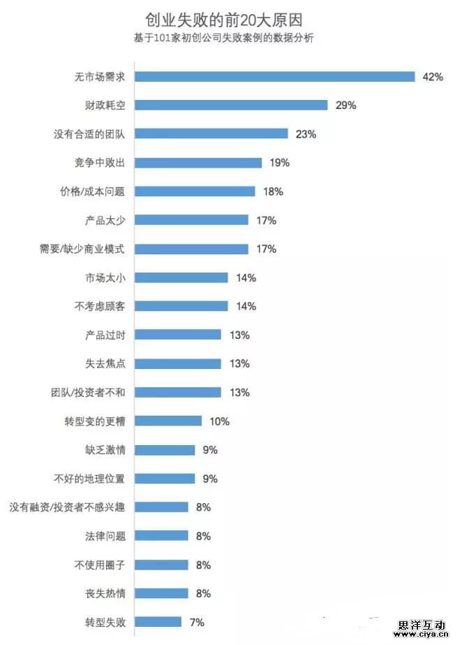 因为很多创业公司有着多个失败原因,你会发现:这突出的 20 大创业失败原因比例加起来不是 100%(远超过 100%)。