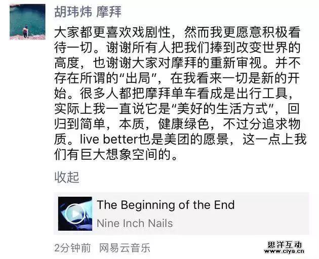 大家都更喜欢戏剧性,然而我更愿意积极看待一切。谢谢所有人把我们捧到改变世界的高度,也谢谢大家对摩拜的重新审视。