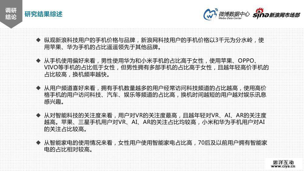 新浪网科技用户中男性多于女性,占比为57.5%;用户手机价格以3千元为分水岭,61.49%的用户更偏爱苹果手机;使用高价格手机的用户访问科技、汽车、娱乐等频道的占比高,换机时间越短的用户越对娱乐讯息感兴趣;从对智能科技的关注度来看,用户对VR的关注度最高,且越年轻对VR、AI、AR的关注度越高。