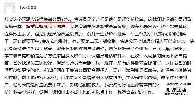 也许有人会说,快递小哥只是一个执行者,罪魁祸首还是快递公司的老板,快递行业的奖励模式就有问题,快递员只有多送快递,才能拿到高工资,快递员为节省时间,才会把快递塞进快递柜: