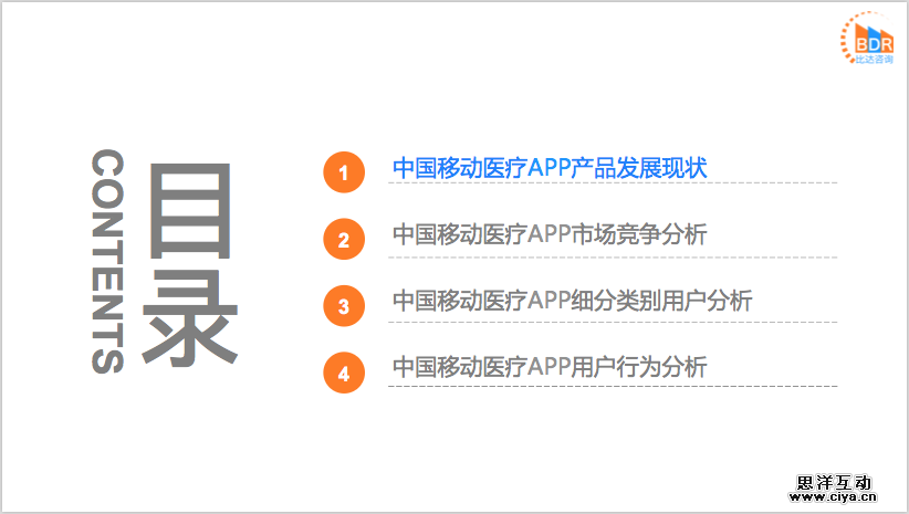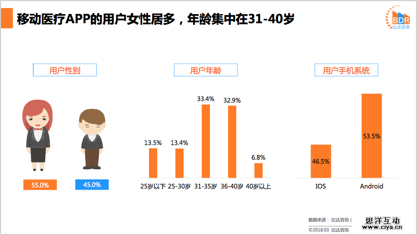 比达咨询(BDR)数据中心监测数据显示,在中国移动医疗APP各细分类别用户中,寻医问诊类APP的用户使用率最高,高达41.5%,而健康管理类APP的用户使用率最低,低至8.4%。在中国移动医疗APP各类别用户渗透率中,寻医问诊类APP仍然占比最高。