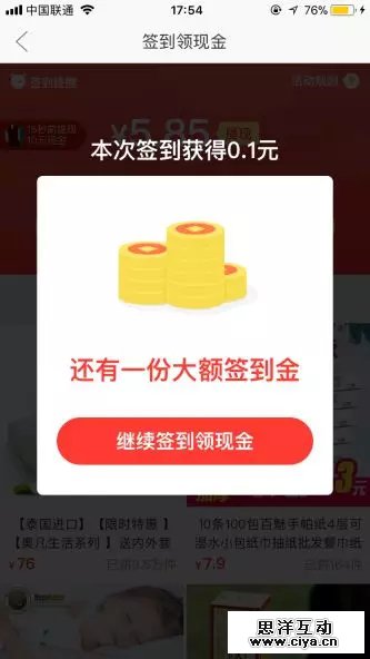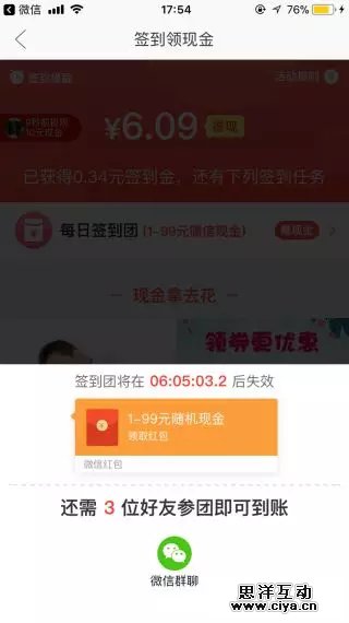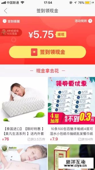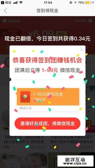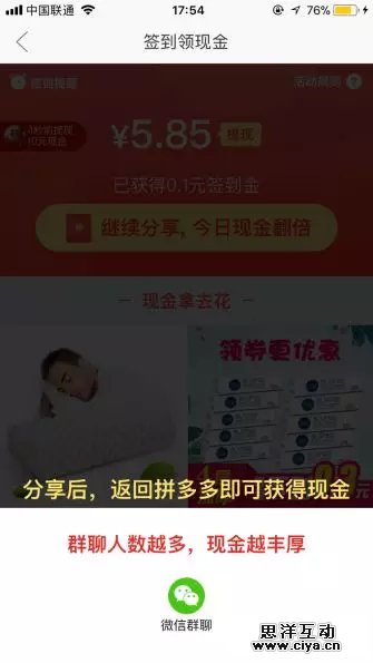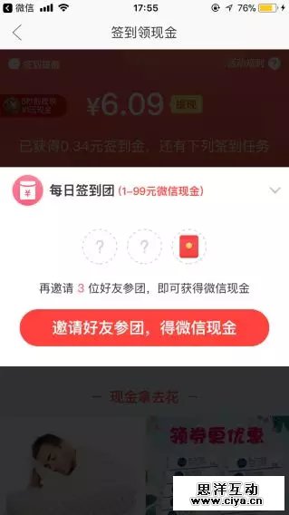 而长线的物质激励,则更应强化“必得”感知。以拼多多的暴力现金玩法为例,用户首先点击现金签到,可以拆出现金红包,分享之后还可以再拆一次。拆完之后还可以发起签到团,在规定时间内团满即可领取现金。
