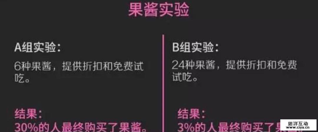 结果发现,A组中有30%的人最终购买了果酱,而B组中只有3%的人购买——都说选择多是好事,会更自由,但过多的选择让B组消费者在比较的过程中心疲力竭,最终放弃了购买。