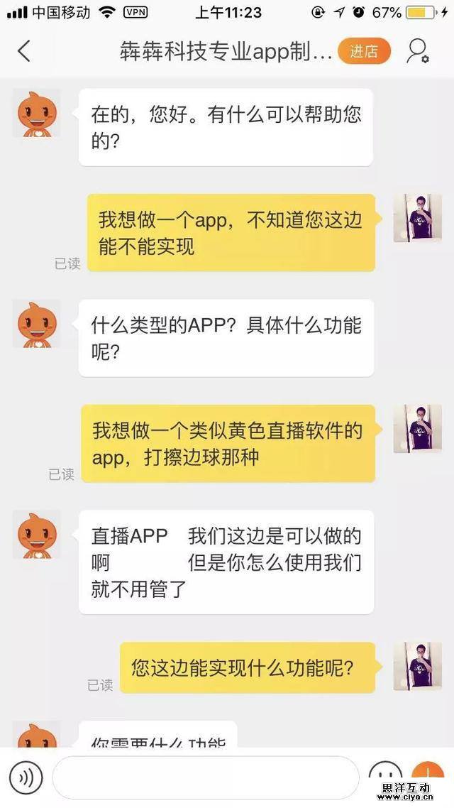 即便不懂技术,在淘宝购买完整的定制软件服务也仅仅需要不到2万元。小娱在一家淘宝店中询问客服,能否制作一款色情直播软件,客服似乎已司空见惯,表示“你用来干什么我不管,反正我能给你做出来。”