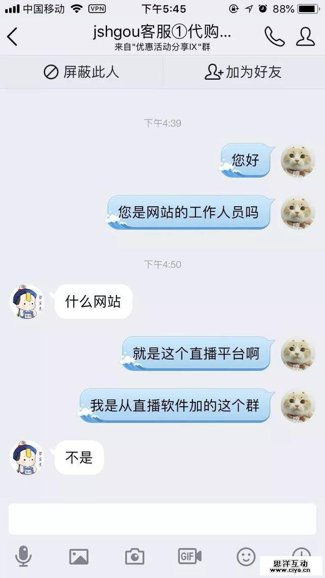 剁椒娱投在群里小窗了一个昵称为“jshgou客服①代购”的人,其直接否认了与色情直播有关联。看起来,这些客服,只是类似淘宝客网站的工作人员,被色情信息吸引而来的用户,此时已经被当做“电商流量”导入了一个新的环节。