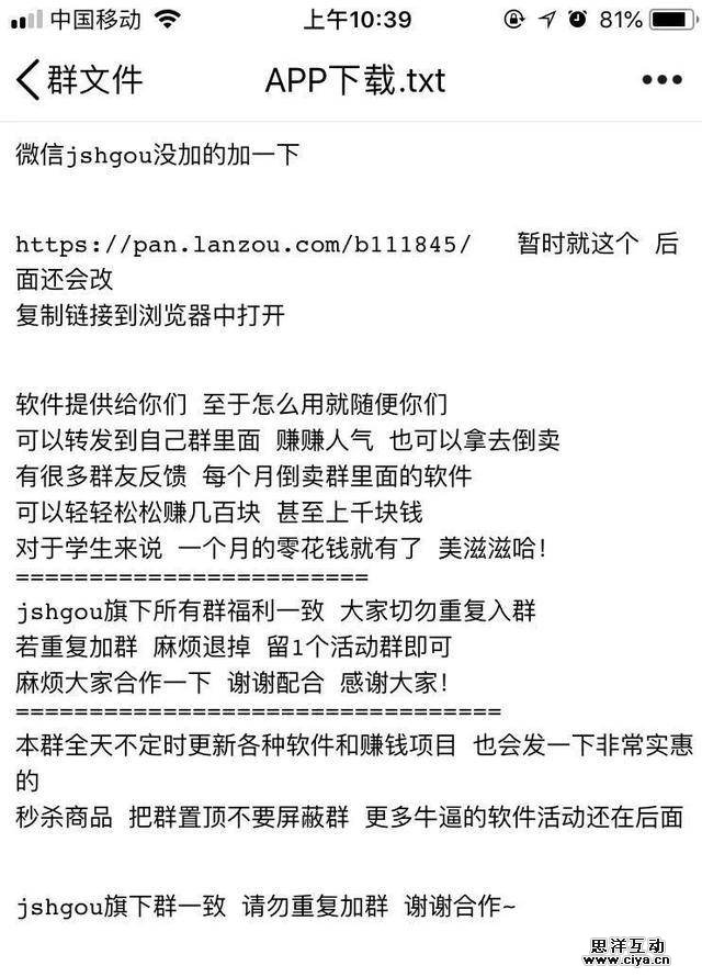 他分享的内容几乎都是“聚实惠购”网站上的淘宝优惠券信息。偶尔会发一些“福利内容”。福利内容与群公告调性相同:所有QQ群用户都可以免费下载群文件中的软件,通过在手游、新浪微博等大流量平台贩卖,赚取零花钱。