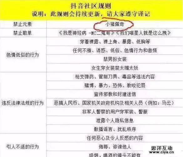 有知乎网友爆料称,抖音更新社区规则,部分元素、歌单、色情低俗、水印、LOGO等内容,将被禁止。在这份曝光的“抖音社区规则列表”中,“小猪佩奇”赫然在列,十分醒目。