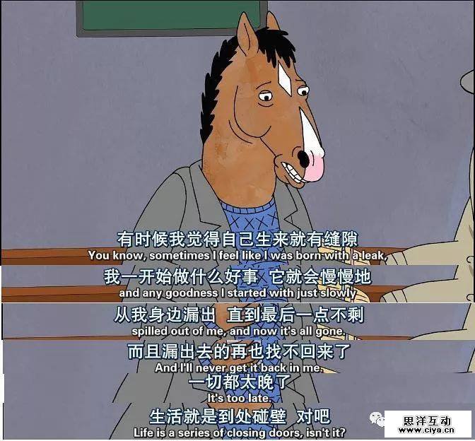 2014年的时候《马男波杰克》一度成为了这种“丧文化”的标志,每次见到有人在分享《马男波杰克》里面的金句,这些如“葛优瘫”一样风靡的丧气满满的话,似乎都有一个不满现实的年轻人隐藏在这些言语的背后哀叹自艾,失意遣怀,把“丧”作为深谙与洞悉世事和人性后的抉择。