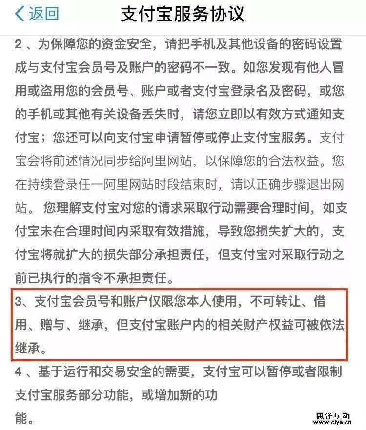在支付宝服务协议中则明确规定:支付宝会员号和账户仅限用户本人使用,不可转让、借用、赠与、继承,但支付宝账户内的相关财产权益可被依法继承。