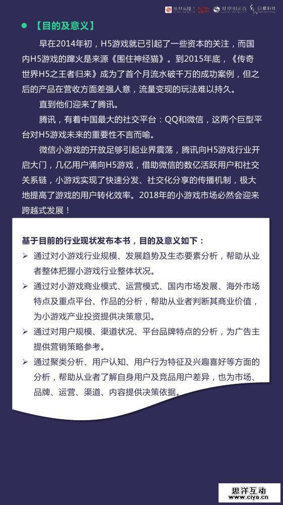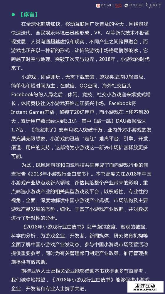 本书高度关注2018年中国小游戏产业热点及新兴领域,深度地解读中国小游戏产业规模、市场结构及主要游戏产品发展的态势,细化、丰富了小游戏产业数据,并对数据进行了针对性的分析。 2018年,中国迎来小游戏元年。白皮书显示,2018年小游戏市场规模预计将达到300亿元,国内用户达5+亿人。以下为报告部分内容:小游戏是指玩法比较轻便,即点即玩,主要渠道在类浏览器、超级App环境下运行的游戏。小游戏现已呈现全品类开放、玩法不断丰富的生态。